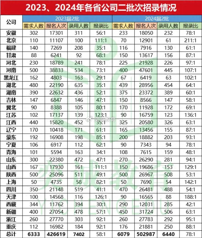 近日,国网各单位发布了24届二批录取名单。一共6440人被录取!首先恭喜上岸的同学们!快来看看各省公司详细录取情况吧!