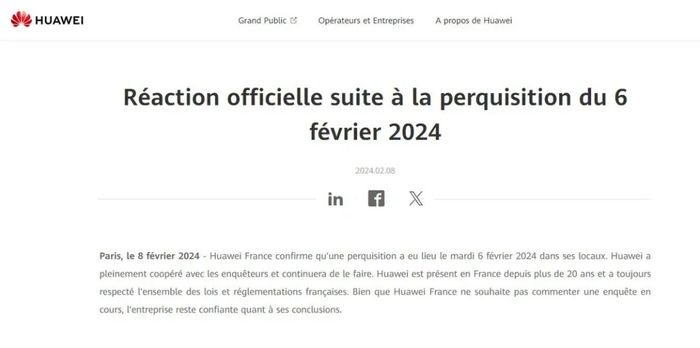 然而根据2024年2月8日最新消息,法国司法界人士称,此次华为遭搜查“不是根据法国反腐败局的报告在楠泰尔展开的调查”。