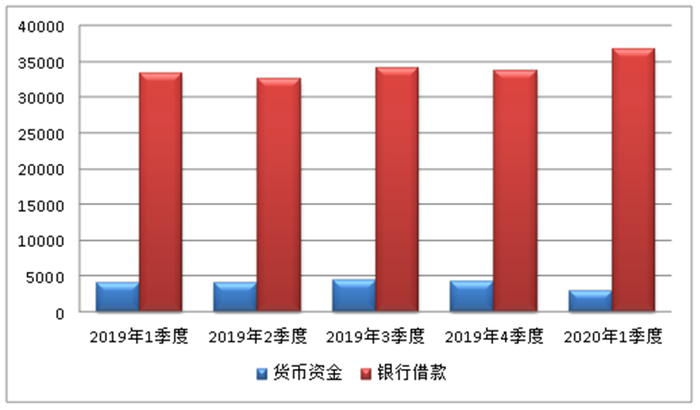 银行借款余额年初33670万元,一季度末36770万元,新增3100万元,资金成本提高,财务费用增加。2019年1季度至2020年1季度货币资金和银行借款余额变动情况见图一。