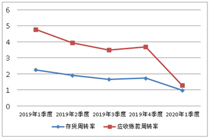 一季度应收账款周转率0.31次,去年同期2.51次,下降2.2次,应收账款拖欠周期较长,占用公司的大量资金成本。2019年1季度至2020年1季度存货周转率和应收账款周转率变动情况见图二。