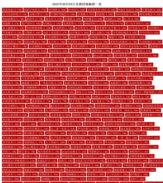 今日涨幅居前的题材概念有:固态电池(6.73%)、钠离子电池(6.37%)、PET铜箔(5.55%)、BC电池(5.5%)、共封装光学(CPO)(5.36%)、钙钛矿电池(5.29%)、石墨电极(5.26%)、动力电池回收(5.18%)、边缘计算(5.14%)、宁德时代概念(5.08%)。