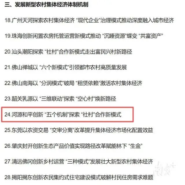 近日,省委改革办、省“百千万工程”指挥部办公室发布了《2025年广东省“百县千镇万村高质量发展工程”集成式改革基层典型案例汇编》,共收录36个体制机制创新案例,涵盖县域产业发展、新型城镇化建设、发展新型农村集体经济、资源要素保障等四大方面,集中展现了广东各地在推动城乡区域协调发展中探索出的可复制、可推广的改革经验与实践路径。其中,和平县创新“五个机制”探索“社村”合作新模式,成功入选。