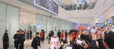 中国足协秘书长袁永清前往机场迎接U23国足,近1200名龙之队球迷前往机场接机,他们高喊“青春无畏,国足扬威““马到成功,越来越好”。