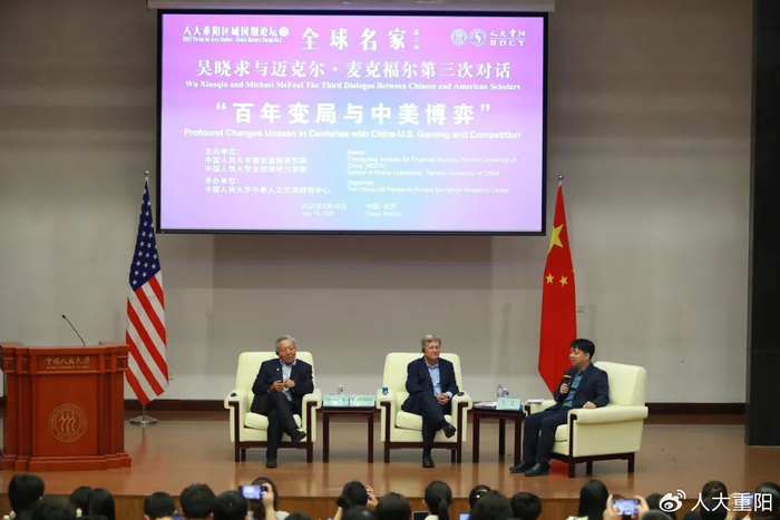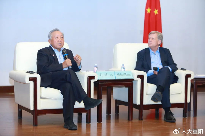 此次讲座邀请到美国前驻俄罗斯大使、美国斯坦福大学弗里曼-斯波格利国际问题研究所主任迈克尔・麦克福尔与国家一级教授、中国人民大学国家金融研究院院长、中美人文交流研究中心(教育部)主任、重阳金融研究院理事吴晓求就“百年变局与中美博弈”展开深度对话。