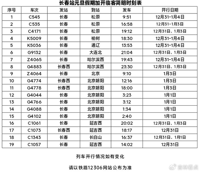 元旦假期以学生流、探亲流、旅游流为主,客流主要集中在北京、大连、哈尔滨以及松原、延吉、白城等方向。为保障节假日期间旅客顺利出行,长春站采取加开临时旅客列车,动车组重联、普速客车加挂等方式增加运能,共加开临时旅客列车19列,最大限度满足旅客出行需求。自入冬以来,“冰雪游”热度持续攀升,为满足节假日期间旅客到哈尔滨游玩需求,长春站日均开行哈尔滨方向旅客列车113列,为旅客创造更加便利的出行条件。