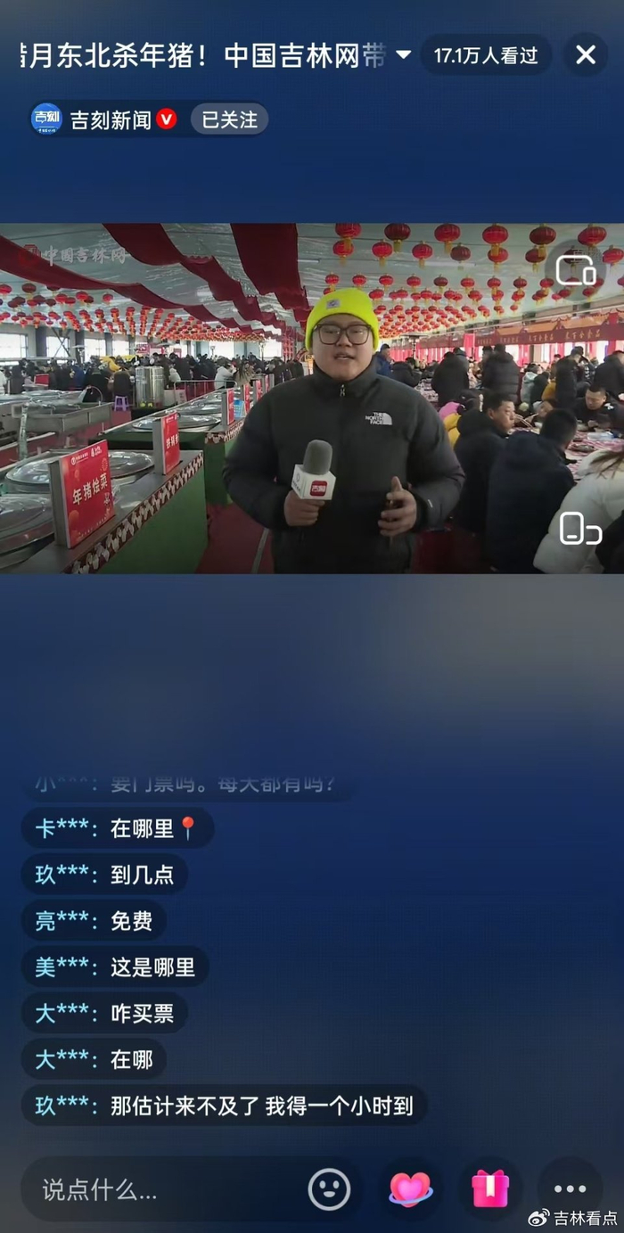 评论区里,“天天有吗?”“去了就有座吗?”“这也太香了!”的提问和感叹刷屏,不少吉林本地网友热情指路“太平池”,还有人笑称“这大户人家的排面,隔着屏幕都流口水”。据主播说,现场超过500人,而且是免费哦!这场直播不仅让在外的东北人感受到了乡愁,也让天南海北的网友直观感受到“东北过年”的热闹与豪爽。