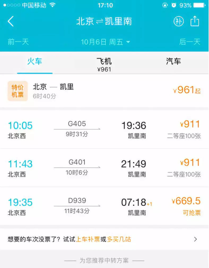 以北京为例,北京至凯里南站高铁,全天共3趟。