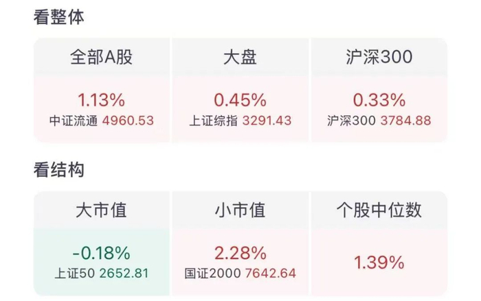 今天A股迎来普涨,尤其是中小盘股,不少小盘股指数涨幅达到2%,个股中位数+1.39%。