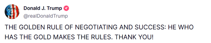 这句话翻译出来是,“谈判与成功的黄金法则:谁拥有黄金,谁就制定规则。谢谢。”这被解读为特朗普在鼓吹黄金。