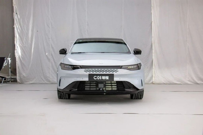 零跑C01增程版的外观延续了与纯电版相似的设计风格,前脸增加了一个小型中网,采用时空胶囊图形的无边界上格栅设计,并在两侧增加了仿进气开口的饰板造型,设计上采用了贯穿式前大灯,整车线条流畅,展现出更强的运动感。
