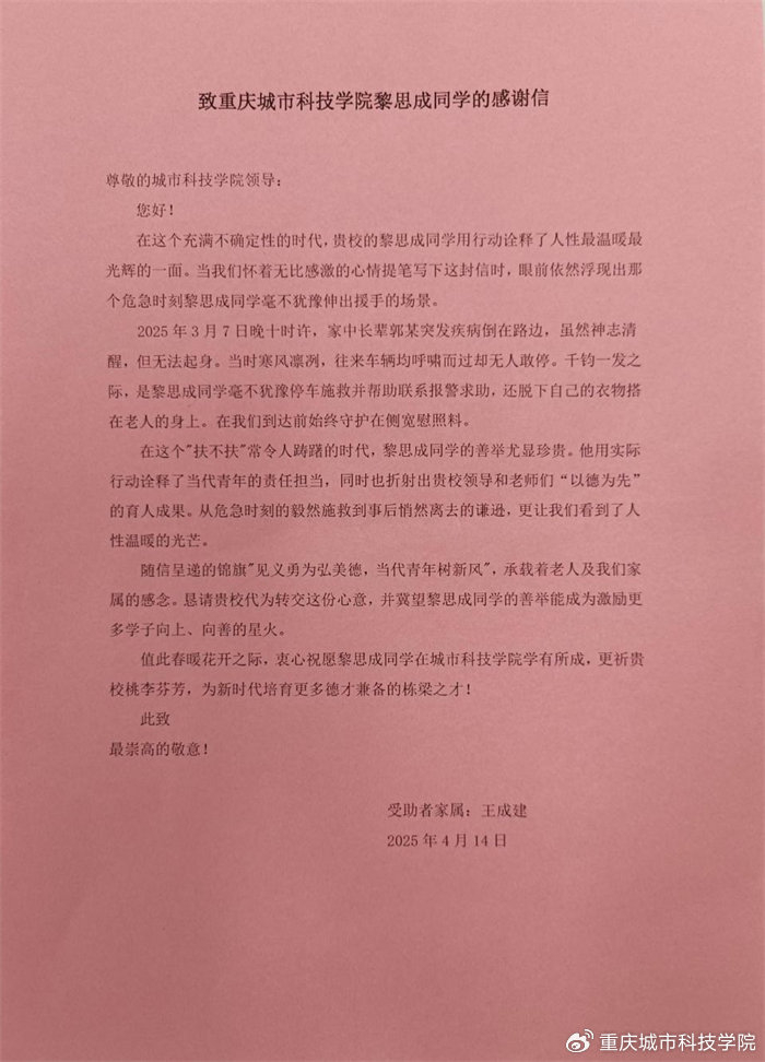 近日,一封饱含深情的感谢信寄到了重庆城市科技学院,信中对该校学生黎思成在危急时刻挺身而出救助老人的善举表达了诚挚感激与高度赞扬。 3月7日晚十时许,一位郭姓老人在路边突发疾病,就地倒下,尽管神志清醒,却无法起身。彼时,道路上来往车辆呼啸而过,却无人敢停。就在这千钧一发之际,路过此地的黎思成同学,没有丝毫犹豫,迅速停下自己的车,冲向老人。 黎思成同学第一时间查看老人的状况,轻声安慰老人,让其不要紧张。在确认老人意识尚清后,他立即拨打报警电话求助。因天气寒冷且担心老人受冻,黎思成同学脱下自己的外套,搭在老人身上,为其保暖。在等待救援的过程中,他始终守护在老人身旁,期间不断安慰和照顾着老人,一直到老人家属和救援人员赶到。 据调查了解,黎思成同学是重庆城市科技学院国际教育学院23级本硕2班的学习委员。他的见义勇为,不仅是一次简单的救助,更是对社会道德风尚的有力践行。在当下,“扶老人”、“扶不扶”是社会高度讨论的话题,遇到这样的情况人们可能会有犹豫和顾虑,但黎思成同学用自己的行动给出了最纯粹、最坚定的答案——善良与勇敢,永远是人性中最闪亮的光芒。