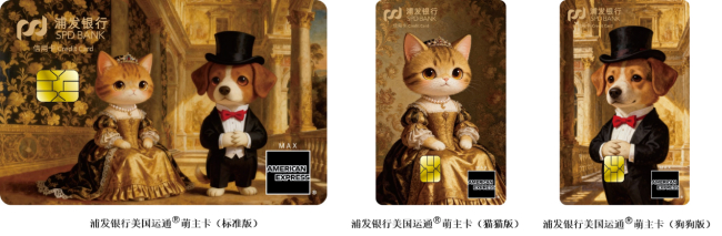浦发运通®萌主卡在卡面设计中将萌宠形象拟人化,共计标准版、猫猫版、狗狗版三个版面,采用布纹工艺,结合光影层次形成油画质感,精致复古,展现审美格调。