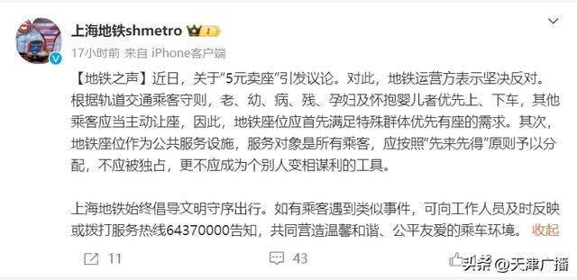 上海地铁“5元卖座”发文者致歉!已被禁言