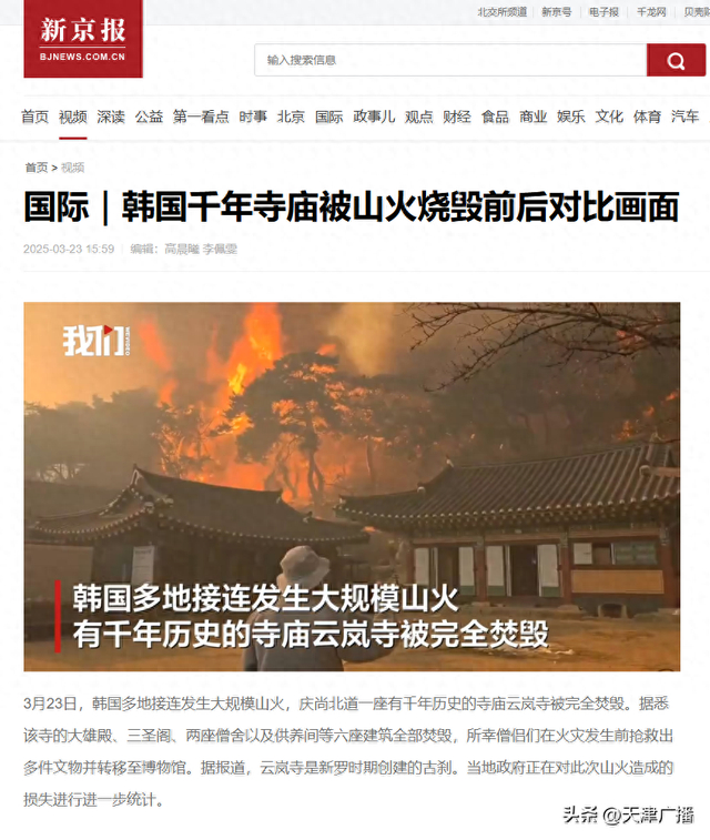 3月23日,韩国多地接连发生大规模山火,庆尚北道一座有千年历史的寺庙云岚寺被完全焚毁。据悉该寺的大雄殿、三圣阁、两座僧舍以及供养间等六座建筑全部焚毁,所幸僧侣们在火灾发生前抢救出多件文物并转移至博物馆。据报道,云岚寺是新罗时期创建的古刹。当地政府正在对此次山火造成的损失进行进一步统计。