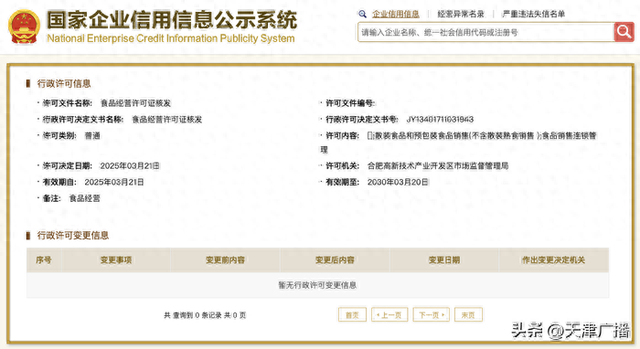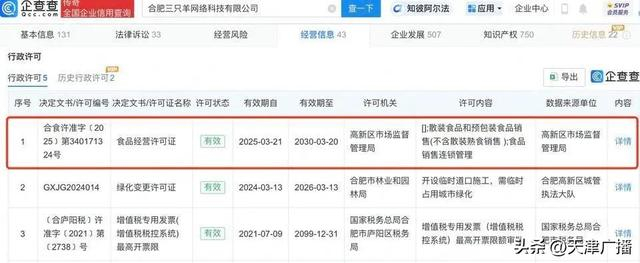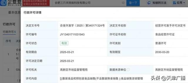 国家企业信用信息公示系统网站显示,近日,合肥三只羊网络科技有限公司新增食品经营许可证,许可内容为散装食品和预包装食品销售(不含散装熟食销售)、食品销售连锁管理,许可机关为合肥高新技术产业开发区市场监督管理局,许可决定日期为2025年3月21日。