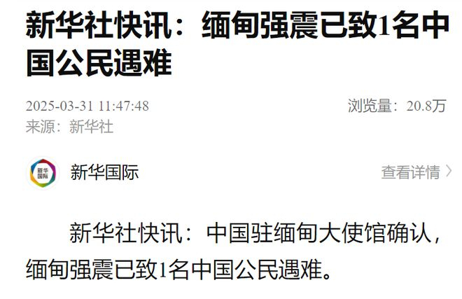 据新华社快讯:中国驻缅甸大使馆确认,缅甸强震已致1名中国公民遇难。