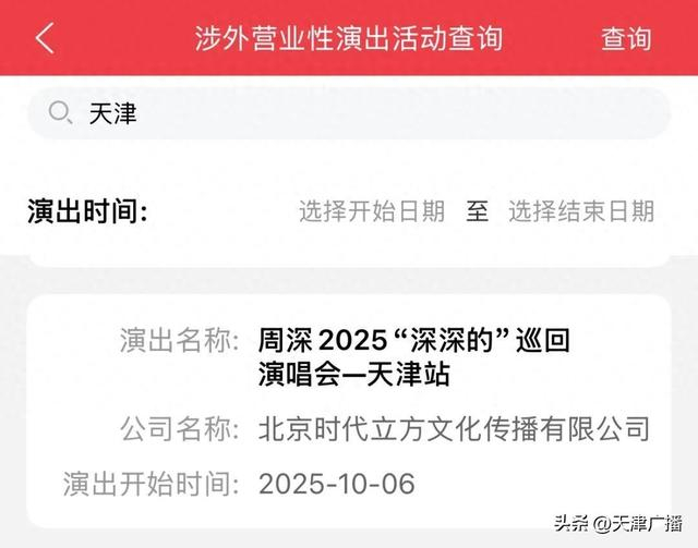 今天(7月4日),全国文化和旅游市场政务服务移动端(文旅市场通)涉外经营性演出活动查询信息显示,《周深2025“深深的”巡回演唱会——天津站》将于2025年10月6日在天津举办。主办方为北京时代立方文化传播有限公司。