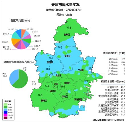 据滨海新区气象台统计,2025年10月8日07时至10月9日07时全区共有82个监测站出现降水,5站暴雨,56站大雨,19站中雨,2站小雨。最大雨量出现在保税区临港区域,雨量为68.8毫米。