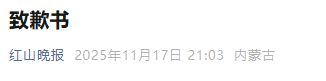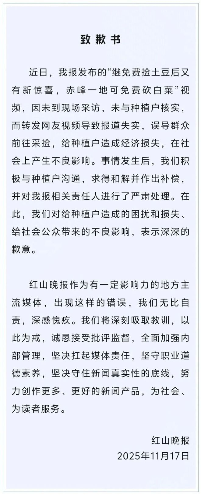 11月17日晚,红山晚报就“免费砍白菜”失实报道致歉:深刻吸取教训,诚恳接受批评。