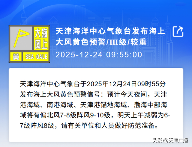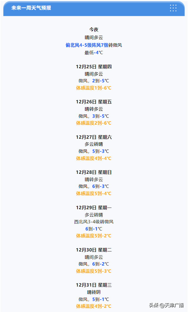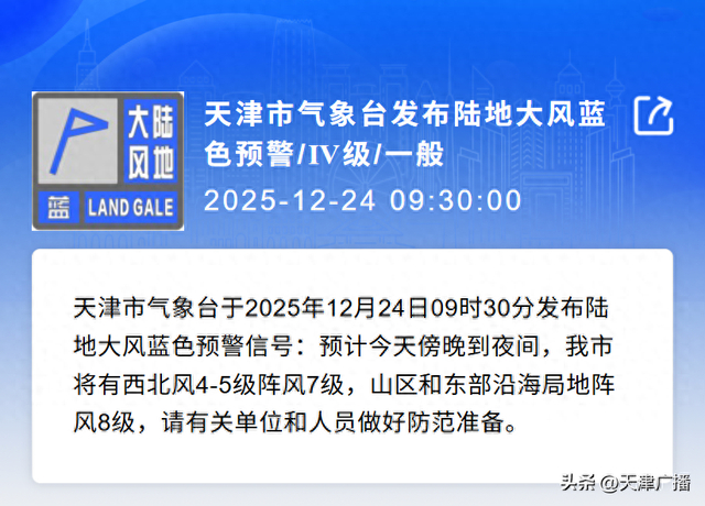据@天津气象 ,预计今天夜间晴间多云,受补充冷空气影响,天津有偏北风4-5级阵风7级,市区最低气温-4℃,目前陆地大风蓝色预警、海上大风黄色预警生效中。