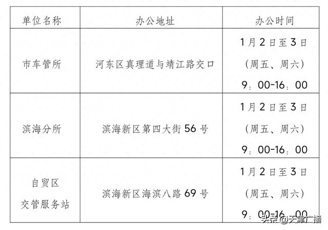 1月2日(周五)、3日(周六),市车管所、滨海分所(包括自贸区交管服务站)对外办公。1月1日(周四)市车管所及分所、自贸区服务站、全市各机动车登记服务站、医院驾驶人服务站暂停办理车驾管业务。