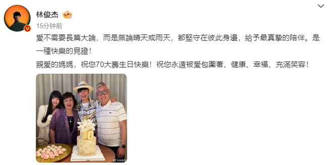 今天(12月29日),@林俊杰 晒出和女友一起陪妈妈庆生的温馨合照,正式官宣恋情。JJ林俊杰写到:“亲爱的妈妈,祝您 70 大寿生日快乐!祝您永远被爱包围着、健康、幸福、充满笑容!”照片中四人笑容灿烂,十分温馨。