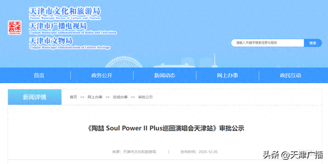 【陶喆将来津连唱三场】据天津市文旅局公示信息,陶喆Soul Power II Plus巡回演唱会天津站将于2026年4月10日、11日、12日在天津奥体中心体育场举办。