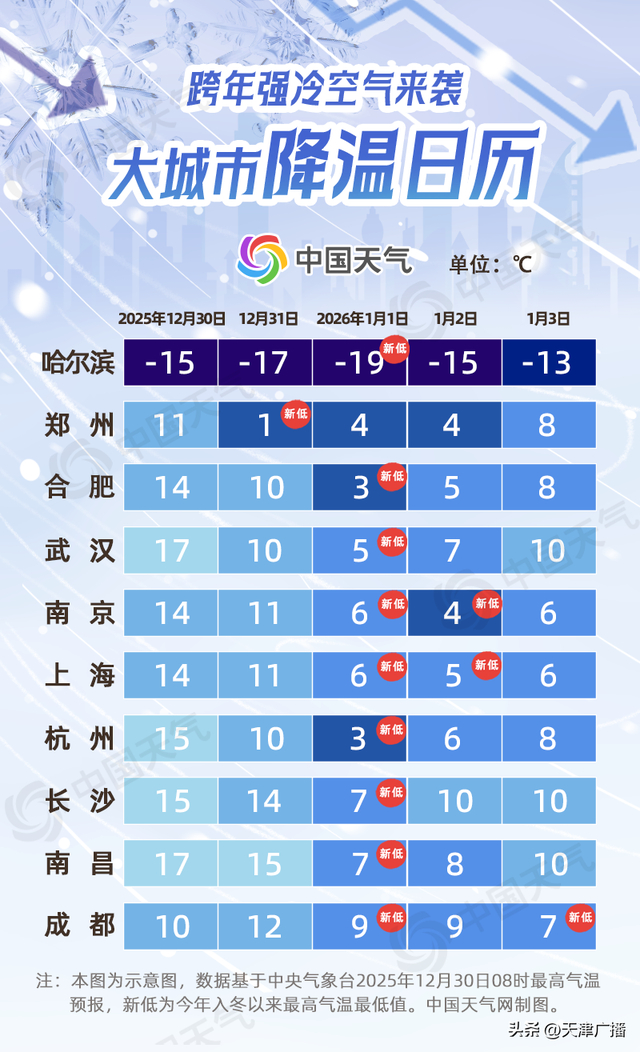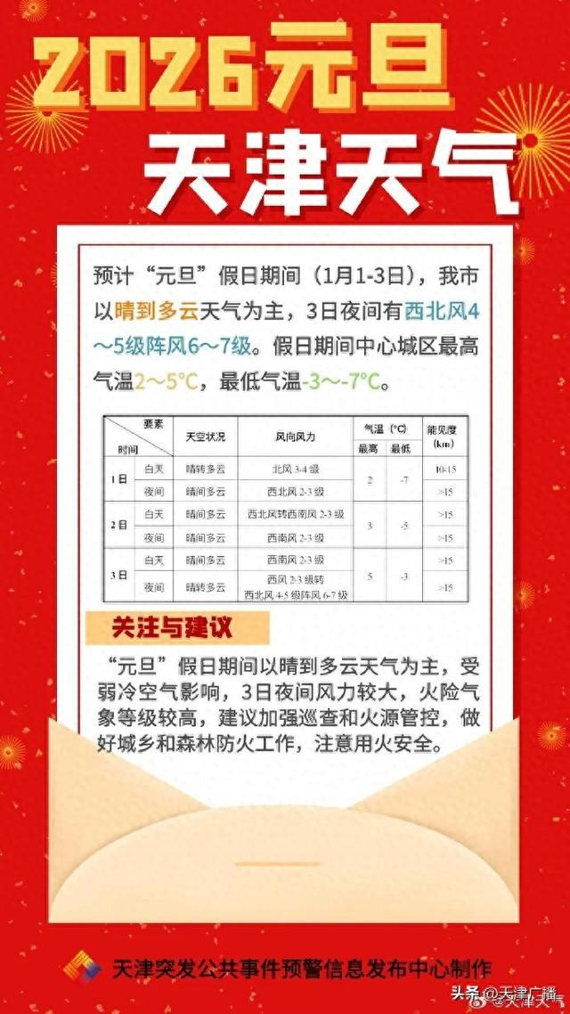 元旦假期期间(2026年1月1日-3日),天津以晴到多云天气为主,1日最高气温仅在2℃上下,2日回升至3℃左右,3日回升至5℃;夜间最低气温-7~-3℃,北部地区-9℃左右。此外,受弱冷空气影响,3日夜间风力加大至西北风4-5级阵风6-7级。