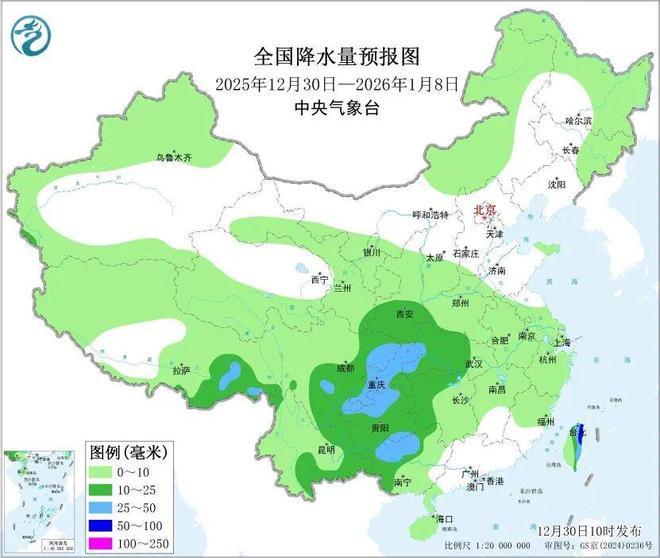 其中,元旦当天,西藏大部、黑龙江东部、甘肃南部、陕西西部、川西高原北部等地部分地区有小到中雪或雨夹雪;假期后两天,西藏东部、川西高原等地还会有降雪出现。