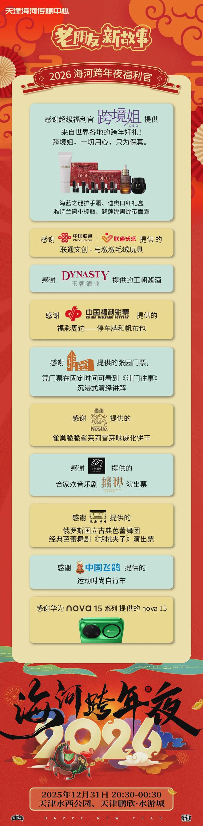 感谢2026海河跨年夜福利官【跨境姐严选商城】、【中国联通-联通沃派品牌】、【王朝酒业王朝酱酒】、【天津市福利彩票发行中心】、【张园《津门往事》】、【雀巢】、【牛奶剧场音乐剧《熊猫》】、【中华剧院芭蕾舞剧《胡桃夹子》】、【中国飞鸽】、【华为nova15系列】