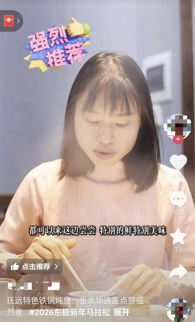 2025年12月31日,张水华再次发布视频称,她试跑了东极新年马拉松的冰雪赛道,即将开启2026年第一场马拉松。当天还有自媒体博主发视频称,张水华在抚远体验了当地特色的铁锅炖鱼,连连称赞称“特别的鲜特别美味”。