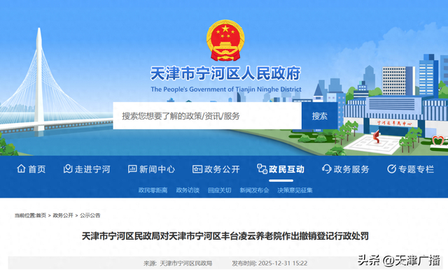 近期,天津市宁河区民政局对天津市宁河区丰台凌云养老院作出撤销登记行政处罚。