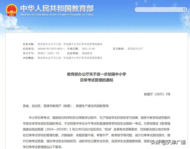 据了解,这是为落实《教育部办公厅关于进一步加强中小学日常考试管理的通知》(教基厅[2025]3号)文件精神。要求减少日常考试测试频次,提升日常考试质量,强化考试安全风险防范,减轻学生过重学业负担,促进学生全面健康发展。