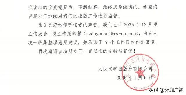 1月6日,人民文学出版社就读者指出的朱自清《经典常谈》编校质量问题致歉,表示将进一步做好流程再造,切实加强出版物质量管理。全文如下:
