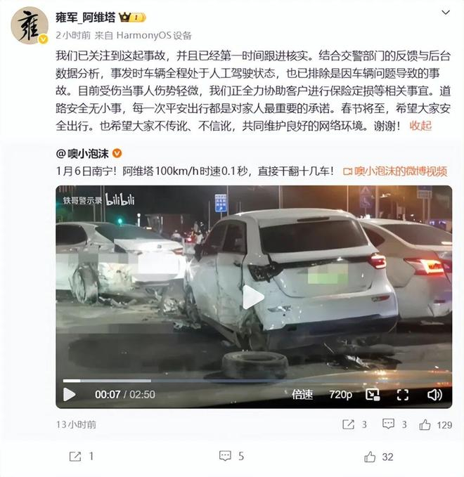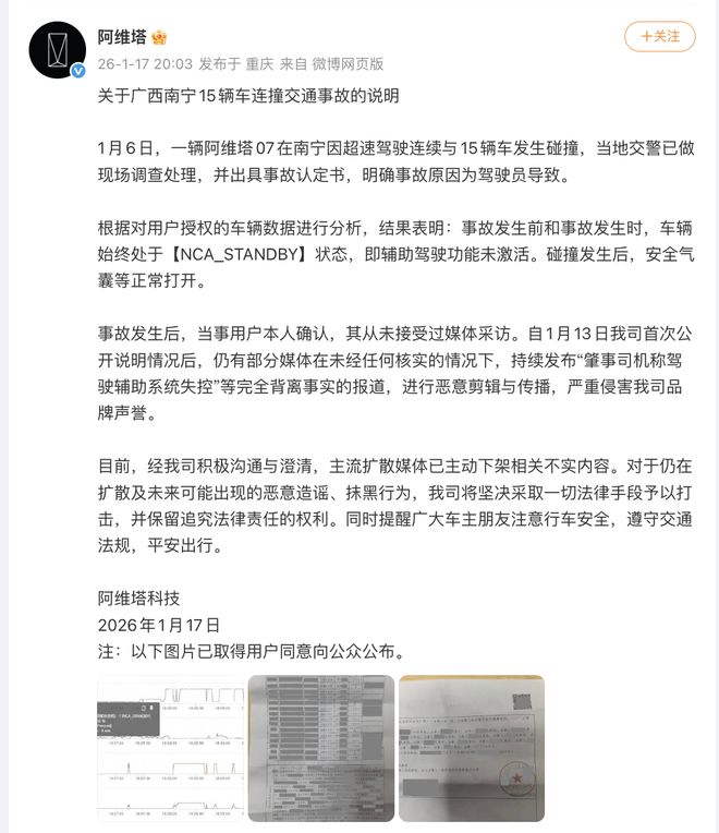 1月17日,@阿维塔 发布 关于广西南宁15辆车连撞交通事故的说明:
