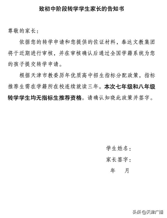 致初中阶段转学学生家长的告知书
