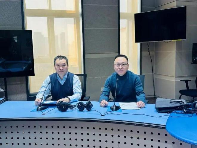 ↑1月16日,天津市民政局养老服务处处长赵康健(左)、副处长陈振海(右)做客天津新闻广播直播间,解答市民老人家食堂、适老化改造等问题