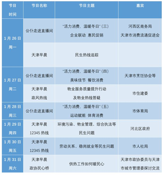 新春佳节将至,迎来旅游和消费旺季,《公仆走进直播间》节目推出“活力消费,温暖冬日”系列节目,分别聚焦民俗文旅消费、旅游新项目、新线路、商圈促销、消费券等活动、春节餐饮市场以及“体育+消费”融合等话题,洞察旅游和消费市场变化,为广大市民朋友送上节日消费攻略。