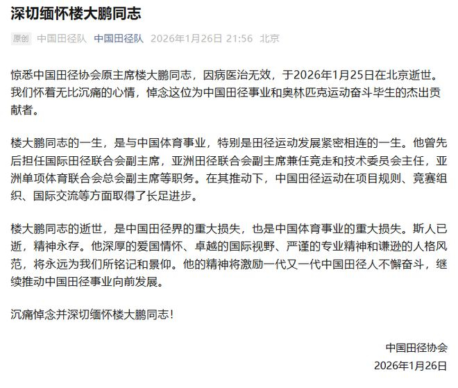 2026年1月26日,中国田径协会发布讣告,中国田径协会原主席楼大鹏同志,因病医治无效,于2026年1月25日在北京逝世。