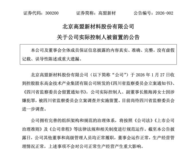 高盟新材公告,公司于2026年1月27日收到控股股东高金技术产业集团有限公司转发的《四川省监察委员会立案通知书》《四川省监察委员会留置通知书》,公司实际控制人、副董事长熊海涛因涉嫌犯罪,被四川省监察委员会立案调查并实施留置。目前尚待四川省监察委员会进一步调查。