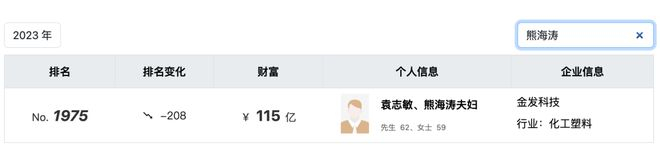 2023年3月23日,胡润研究院发布《2023胡润全球富豪榜》,袁志敏、熊海涛以115亿财富位列榜单第1975位。