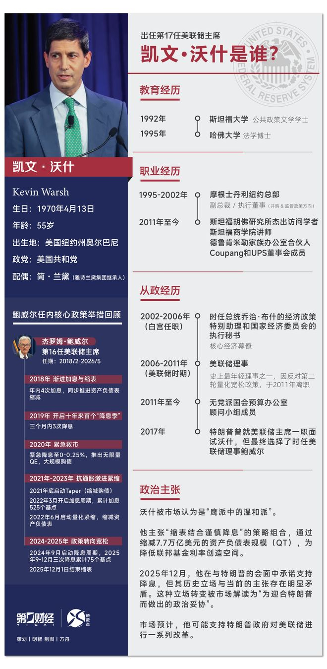 △凯文·沃什(资料图)沃什2006年加入美联储,是当时最年轻的美联储理事。在美联储任职期间,沃什持鹰派货币政策立场,但近年转向支持特朗普的关税政策及加快降息立场。特朗普在首个总统任期内提名鲍威尔为美联储主席。当时,鲍威尔与沃什均为特朗普考虑的人选,但鲍威尔最终获得提名。