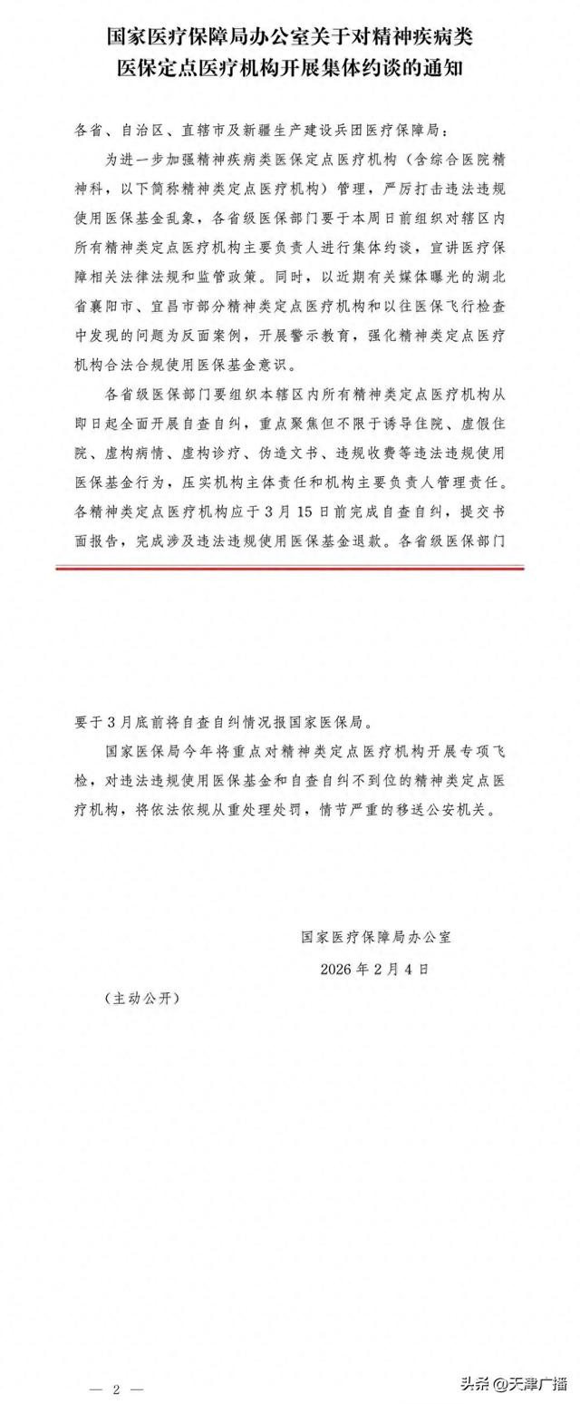 国家医保局今天发出通知,为进一步加强精神疾病类医保定点医疗机构(含综合医院精神科,以下简称精神类定点医疗机构)管理,严厉打击违法违规使用医保基金乱象,各省级医保部门要于本周日前组织对辖区内所有精神类定点医疗机构主要负责人进行集体约谈,宣讲医疗保障相关法律法规和监管政策。