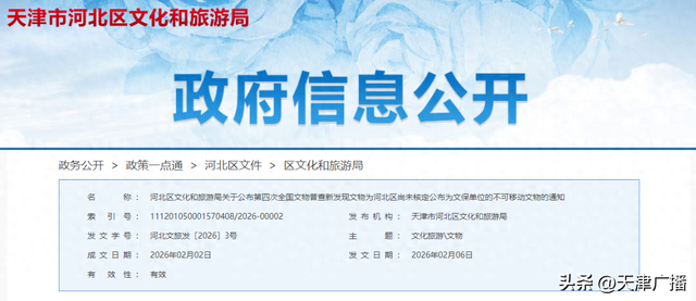 2月6日,天津市河北区文化和旅游局发布《河北区文化和旅游局关于公布第四次全国文物普查新发现文物为河北区尚未核定公布为文保单位的不可移动文物的通知》。