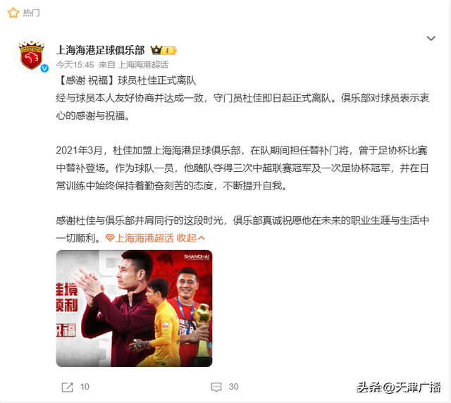 俱乐部对球员表示衷心的感谢与祝福。感谢杜佳与俱乐部并肩同行的这段时光,俱乐部真诚祝愿他在未来的职业生涯与生活中一切顺利。