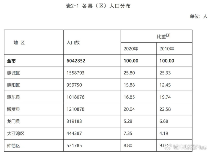 七普数据显示,2020年惠州全市人口6042852人,其中惠城区155.88万人、惠阳区95.98万人、大亚湾区44.44万人、仲恺区53.18万人。