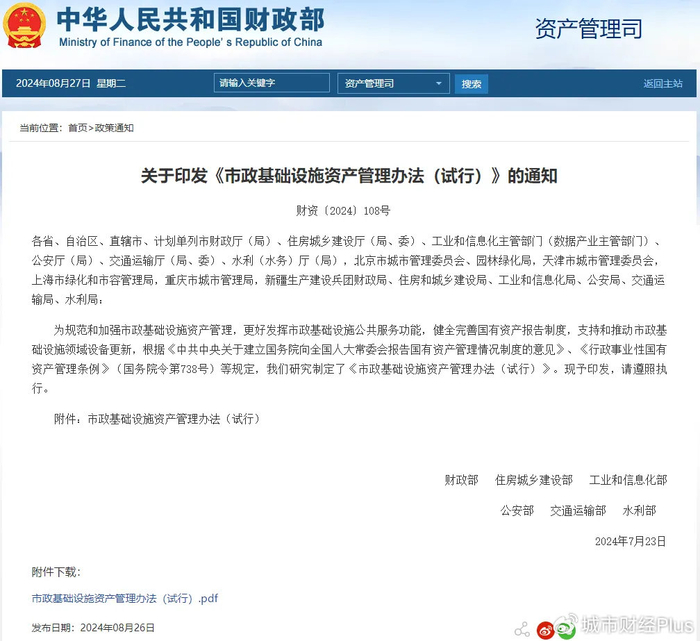 这一演变,最终导致去年8月份财政部、住建部、工信部、公安部、交通部、水利部联合发布了《市政基础设施资产管理办法(试行)》的通知。