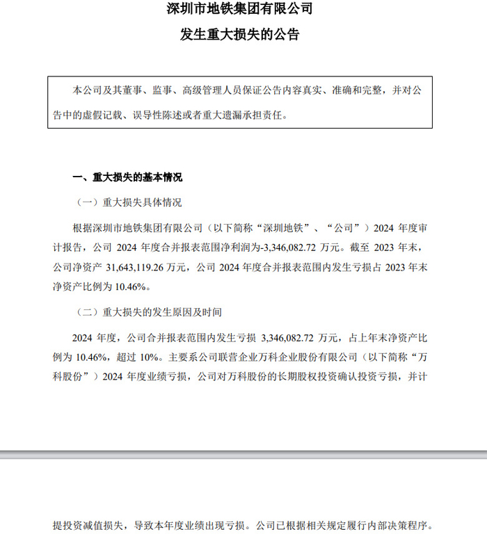 截至2024年末,深铁集团合并报表范围内发生亏损334.6亿元,占上年末净资产比例为10.46%,超过10%。