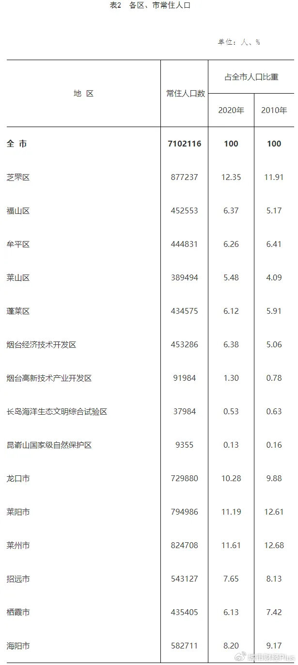 市区人口方面,2020年烟台进行了区划调整,撤销了蓬莱市、长岛县,设立烟台市蓬莱区。