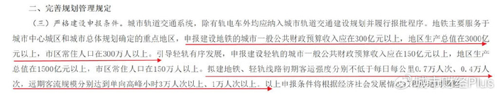 也即,申报地铁的城市,需要同时符合GDP在3000亿以上,财政收入在300亿以上,市区常住人口在300万以上,初期客运强度不低于0.7万人次,远期客流规模单项高峰小时3万人次以上。